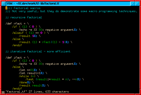 Tf is also available with a vim editor ("vi improved"), “a marvelous replacement for vi. Among its many extensions to traditional vi is syntax coloring. I have created a vim syntax coloring file for tinyfugue, tf.vim, which produces results like those in the sample below.” The web site provides links to information and files on how to use these enhancements.